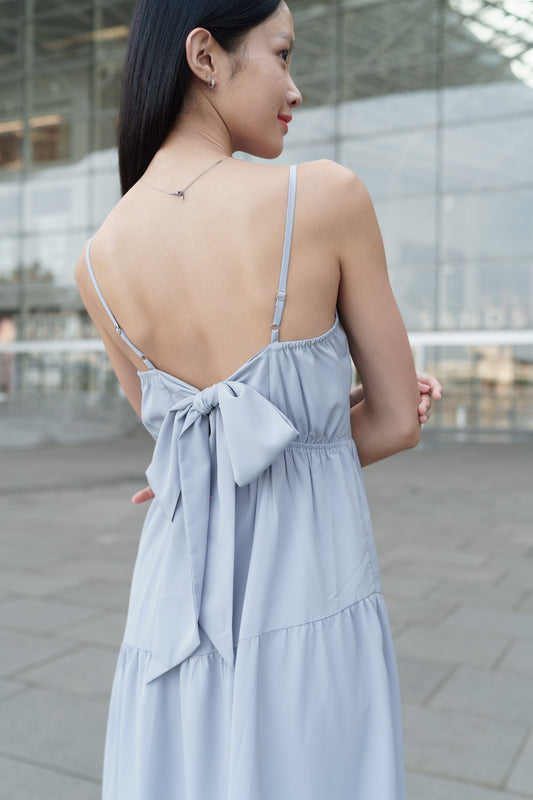 VIONA PADDED TIE-BACK RIBBON TIERED MAXI DRESS(DUSTY BLUE)