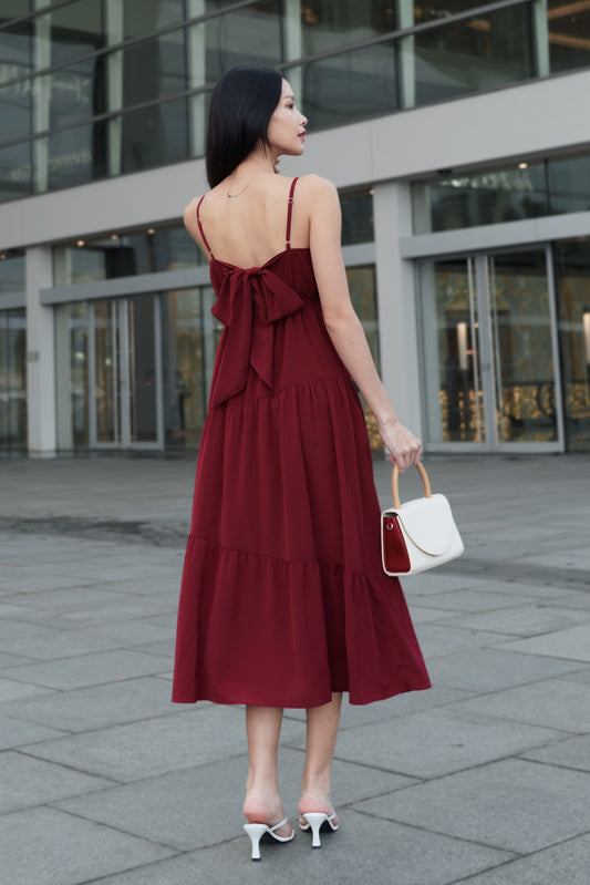 VIONA PADDED TIE-BACK RIBBON TIERED MAXI DRESS(MAROON)