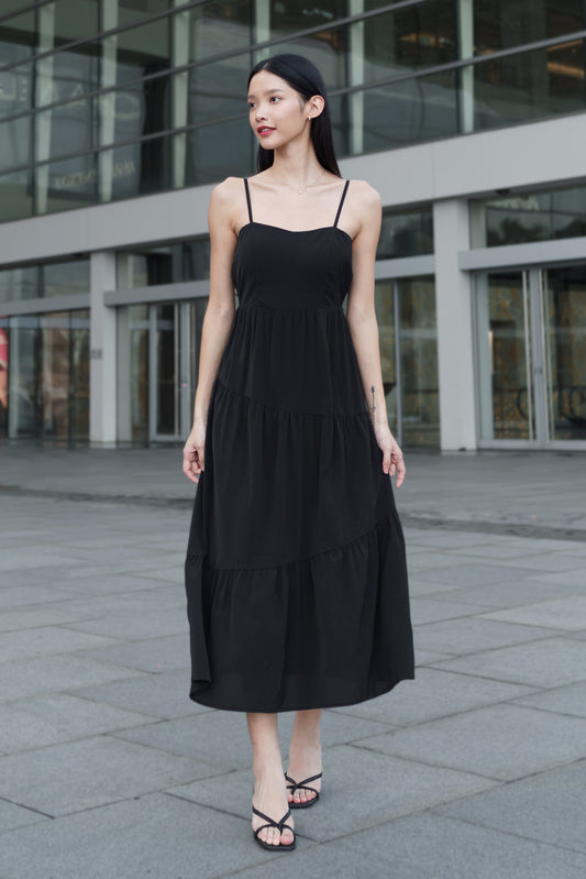 VIONA PADDED TIE-BACK RIBBON TIERED MAXI DRESS(BLACK)