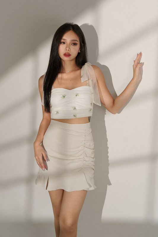 ELOWYN FLUTTER HIGH WAIST RUCHED SLIT SKORTS(LIGHT OAT)