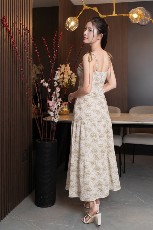 ESTELLA FLORAL RIBBON LACE TRIM TIERED MAXI SKIRT (LIGHT OLIVE)