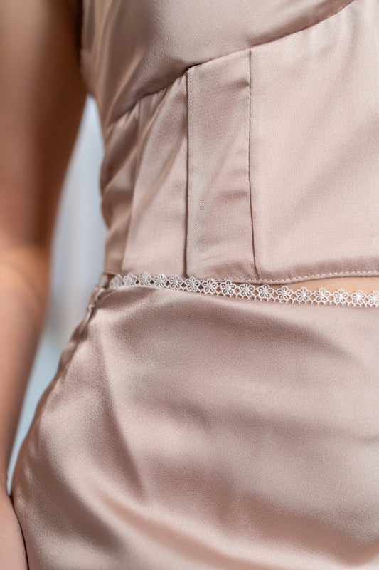 ANISA PADDED SATIN SWEETHEART FLORAL LACE TRIM TOP (BRONZE GOLD)