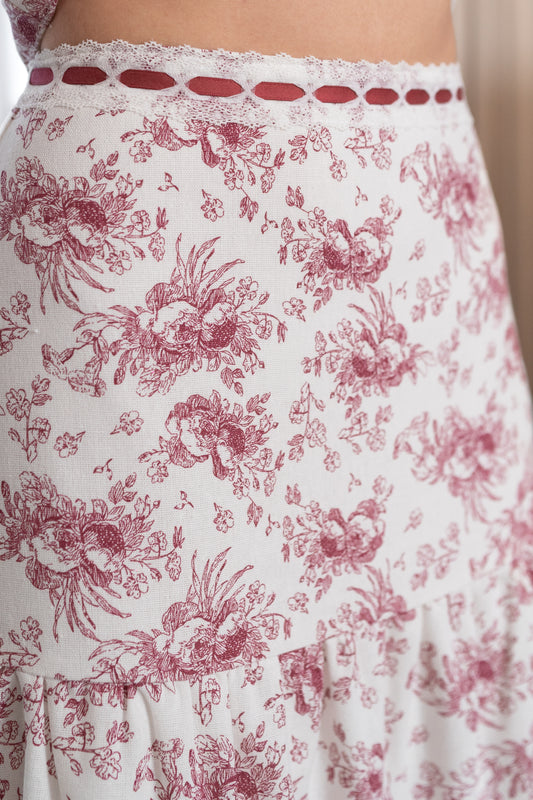 ESTELLA FLORAL RIBBON LACE TRIM TIERED MAXI SKIRT (BERRY BLOSSOM)