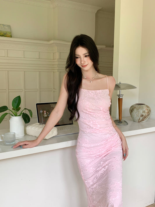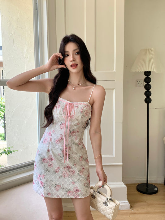AURELIA RIBBON-TIE LACE TRIM DRESS (PINK)