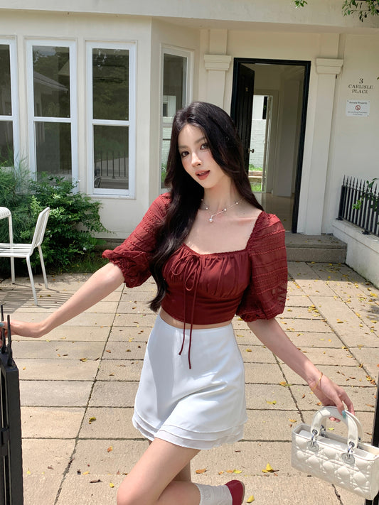 ZINNIA PUFFY SLEEVE LACE TRIM TOP (MAHOGANY RED)