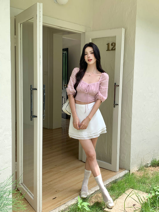 ZINNIA PUFFY SLEEVE LACE TRIM TOP (LIGHT PINK)