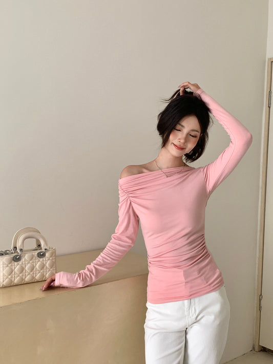 TIERNA OFF-SHOULDER RUCHED LONG SLEEVE TOP (PINK)