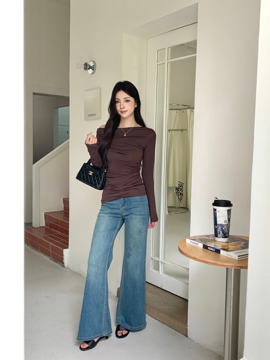 TIERNA OFF-SHOULDER RUCHED LONG SLEEVE TOP (BROWN)