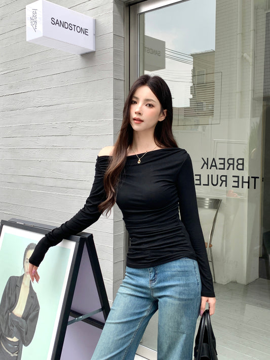 TIERNA OFF-SHOULDER RUCHED LONG SLEEVE TOP (BLACK)