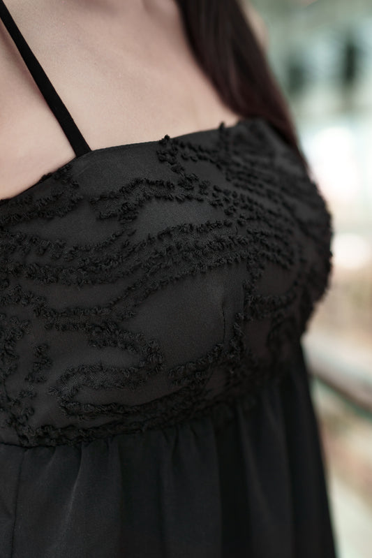 LUNA PADDED TEXTURED EMBROIDERED MAXI DRESS(BLACK)