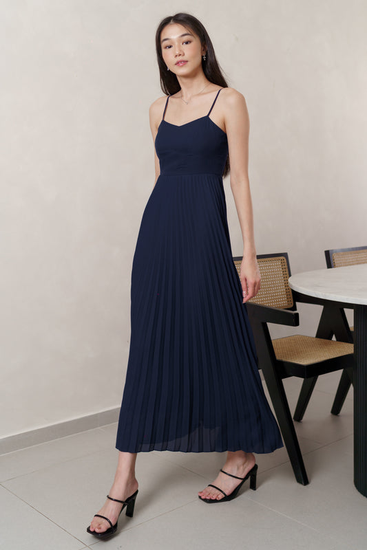 V2 YUNA PADDED RIBBON PLEATED MIDAXI DRESS (NAVY BLUE)