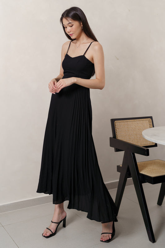 IZEL PADDED PLEATED FLARE MAXI DRESS (BLACK)